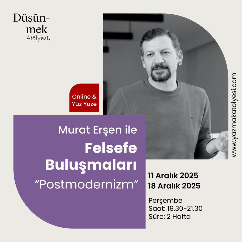 Yayıncılık dünyasında çevirmen, editör ve danışman olarak faaliyet gösteren, özellikle felsefe alanında Fransızca ve İngilizce’den seksenden fazla kitabı Türkçeye kazandırmış olan Murat Erşen, Aralık ayında “Postmodernizm” temasını ele alacağı Felsefe Buluşmaları’yla Yazmak Atölyesi’nde. Murat Erşen ile Felsefe Buluşmaları düşünmek, sorgulamak ve tartışarak fark etmek isteyen herkesi Yazmak Atölyesi’nin sıcak atmosferine bekliyor.