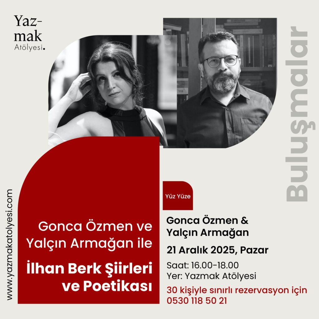 “İlhan Berk Şiiri ve Poetikası” söyleşisiyle, Gonca Özmen ve Yalçın Armağan Yazmak Atölyesi’nde. Söyleşide, Berk’in şiirindeki imge zenginliği, üslubu ve bireyle evren arasında kurduğu köprüler ele alınarak; şiirinin hem estetik hem de felsefi boyutları konuşulacak.