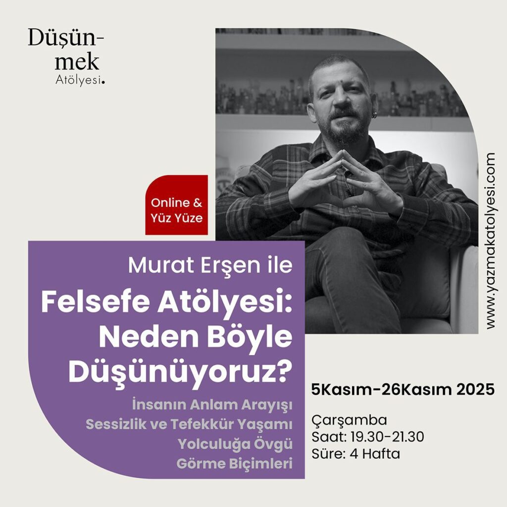 Yayıncılık dünyasında çevirmen, editör ve danışman olarak faaliyet gösteren, özellikle felsefe alanında Fransızca ve İngilizce’den seksenden fazla kitabı Türkçeye kazandırmış olan Murat Erşen, Kasım ayında yepyeni temalarla “Felsefe Atölyesi; Neden Böyle Düşünüyoruz?” ile Yazmak Atölyesi’nde. “İnsanın Anlam Arayışı”, “Sessizlik ve Tefekkür Yaşamı”, “Yolculuğa Övgü” ve “Görme Biçimleri” temaları Viktor Frankl, Terry Eagleton, Wittgenstein ve Heidegger gibi düşünürlerin eşliğinde belirlenen sorulara yapılmış yorumlara odaklanılacak. Murat Erşen ile Felsefe Atölyesi: Neden Böyle Düşünüyoruz? felsefenin hem klasik hem çağdaş tartışmaları ışığında, düşünmeye, sorgulamaya ve fark etmeye açık herkesi bekliyor.