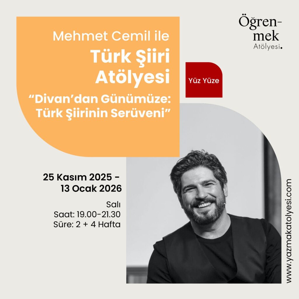 Yazmak Atölyesi’nin bir diğer yeni programı Mehmet Cemil ile Türk Şiiri Atölyesi “Divan’dan Günümüze: Türk Şiirinin Serüveni”. “Divan’dan Günümüze: Türk Şiiri Atölyesi” bu dilin katmanlarını çözmek, sesini yeniden duymak isteyenler için tasarlandı. Sekiz haftalık programda, Yunus Emre’den Fuzuli’ye, Tevfik Fikret’ten Cemal Süreya’ya, Lale Müldür’den günümüz genç şairlerine kadar uzanan bir çizgide hem tarihsel dönüşüm hem de şiirin ruhsal derinliği birlikte okunacak. Her oturumda metin çözümlemeleri, yaratıcı yazma egzersizleri ve tartışmalarla katılımcı sadece bir dinleyici değil, şiirin içinde yol alan bir yorumcuya dönüşecek. Mehmet Cemil ile Türk Şiiri Atölyesi “Divan’dan Günümüze: Türk Şiirinin Serüveni” atölyesi şiire yeniden inanmak, kelimelerin nasıl bir ruh taşıdığını keşfetmek ve kendi sesini bulmak isteyen herkese açıktır.