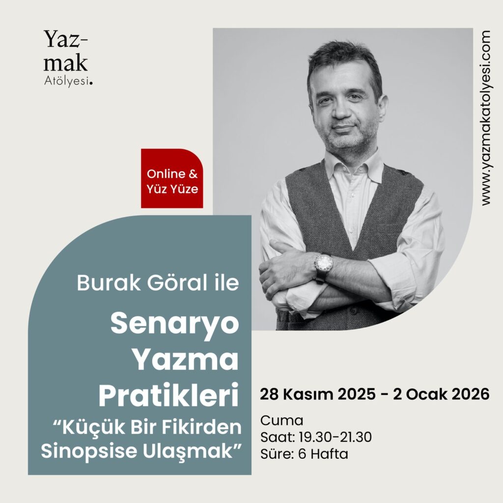 Kasım ayı atölye programında geçtiğimiz sezon ilgiyle takip edilen, film eleştirmeni, yazar ve senarist Burak Göral ile Senaryo Yazma Pratikleri “Küçük Bir Fikirden Sinopsise Ulaşmak” atölyesi başlıyor. Altı hafta sürecek atölyede, olay örgüsü, karakter yaratma, yapı oluşturma, sinopsis ve tretman hazırlama, diyalog yazma, hikâyedeki durumları sahneleştirme konuları ele alınacak. Atölyenin son haftası, katılımcıların tamamlanan sinopsislerinin değerlendirmesi yapılacak ve proje dosyası hazırlamanın gerekleri üzerinde durulacak. Burak Göral ile Senaryo Yazma Pratikleri “Küçük Bir Fikirden Sinopsise Ulaşmak” atölyesi, senaryosunun tek sayfalık sinopsisini ve proje dosyasını oluşturmak isteyen katılımcıları bekliyor.