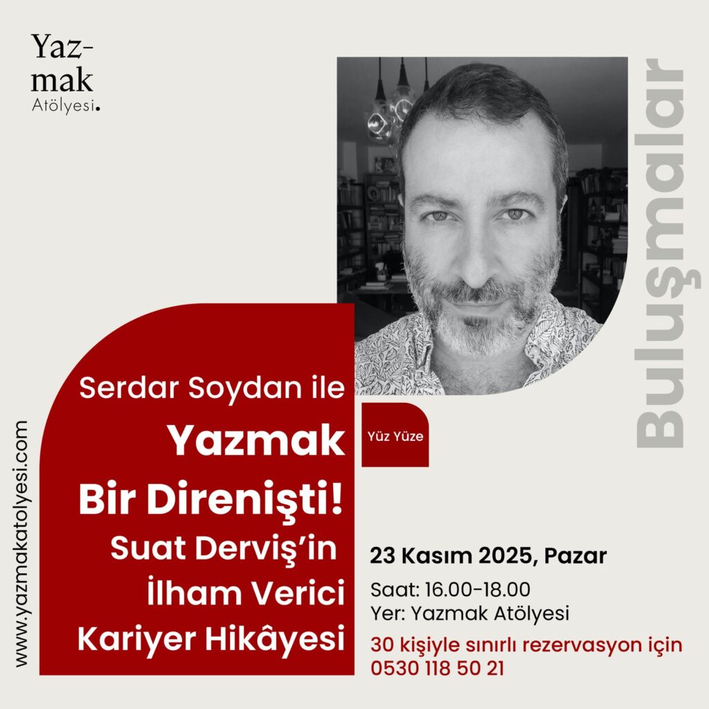 Söyleşi programının bir diğer buluşmasında ise Yazmak Bir Direnişti! Suat Derviş’in İlham Verici Kariyer Hikâyesi’ni Serdar Soydan’dan dinleyeceğiz. Erken yaşta edebiyatla kurduğu bağı, gazeteciliğe adanan yıllarını, toplumcu gerçekçi duruşunu ve kadın sesini yükselten üretimini derinlemesine konuşacağız. Suat Derviş’in Berlin’de aldığı eğitimden İstanbul’a dönüş dönemine; “Fosforlu Cevriye” gibi eserlerin yaratım sürecinden baskı ve sansür dönemlerindeki direncine; mahkemelerde kalemine sahip çıkışından gönüllü sürgün yıllarına kadar uzanan bir yolculuk yaşayacağız. Serdar Soydan bu söyleşide bizlere, Suat Derviş’in yalnızca yaşam öyküsünü değil; kalemi direnişle bütünleşmiş bir yazarın, bastırılan sesin nasıl yeniden yükseldiğini konuşma fırsatı da sağlayacak. Edebiyatın direniş potansiyeline ilgi duyan, yazmak isteyen, düşünmek isteyen herkes; bu buluşmaya davetlidir.
