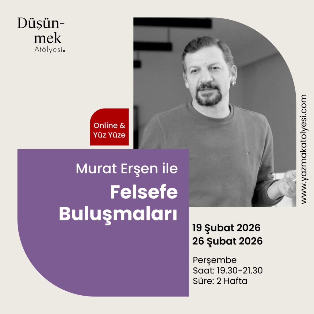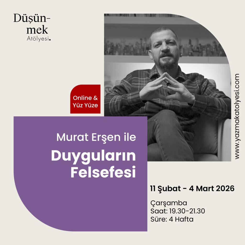 “Aşk ve Yalnızlık”, “Sıkıntı, Kaygı, Korku”, “Yabancılaşma”, “Dünyadan Bezmişlik” konularının ele alınacağı “Duyguların Felsefesi” atölyesi Şubat ayında da yayıncılık dünyasında çevirmen, editör ve danışman olarak faaliyet gösteren, özellikle felsefe alanında Fransızca ve İngilizce’den seksenden fazla kitabı Türkçeye kazandırmış olan Murat Erşen’den dinlenecek.Erşen, Duyguların Felsefesi ve Felsefe Buluşmaları programlarıyla Şubat ayında da Yazmak Atölyesi’nde olacak. Yazmak Atölyesi’nin sıcak atmosferinde sorgulamak, tartışarak fark etmek isteyen herkes Murat Erşen ile gerçekleşecek seminer programlarına davetlidir.