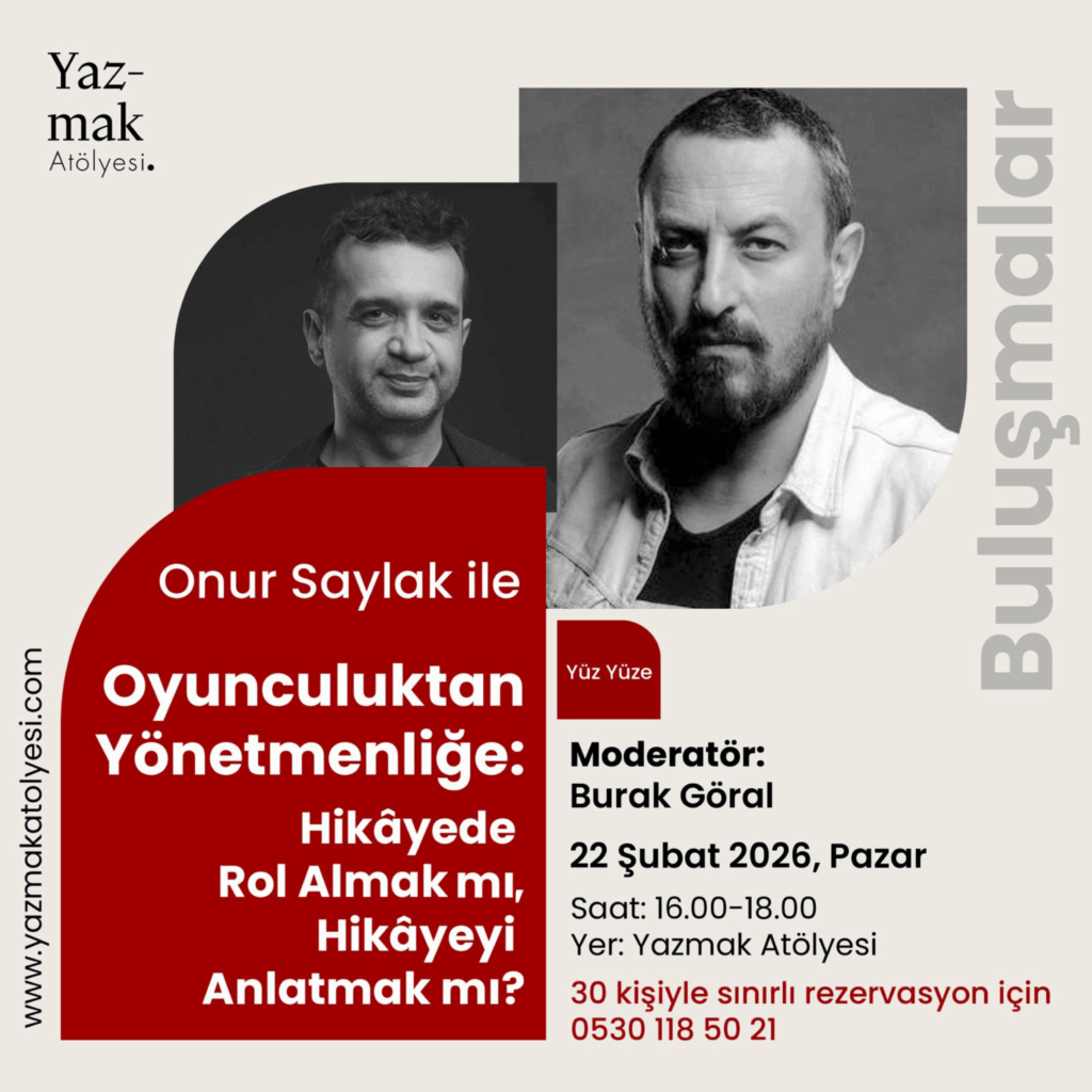 Film eleştirmeni ve senarist Burak Göral, bu ay yönetmen, oyuncu ve senarist Onur Saylak ile “Oyunculuktan Yönetmenliğe: Hikâyede Rol Almak mı, Hikâyeyi Anlatmak mı?” söyleşisiyle bizlerle olacak. Saylak’ın oyunculuktan yönetmenliğe uzanan sanat yolculuğu; anlatı kurma, bakış açısı ve yaratıcı sorumluluklar ekseninde ele alınacak. Oyuncu olarak hikâyenin içinde var olmanın deneyimi ile yönetmen olarak hikâyeyi bütünüyle kurmanın farkları, sinema ve dizi üretiminden örneklerle konuşulacak. Moderatörlüğünde usta film eleştirmeni ve senarist Burak Göral’ın yer alacağı buluşmaya, sinemanın mutfağına yakından bakmak isteyen tüm sinemaseverler davetlidir.